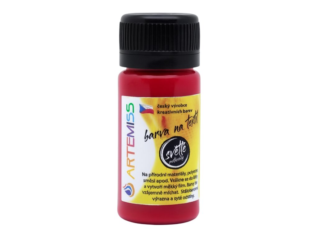 Farba na textil tmavo červená, je určená predovšetkým na svetlé materiály. Pre zdobenie tmavých a pestrých podkladov používajte farbu na tmavý textil. Rozdiel medzi farbou na svetlý a tmavý textil je ten, že farba na svetlý textil sa vsiakne do vlákien, oproti tomu farba na tmavý textil zostáva viac na povrchu. Z toho dôvodu farba na svetlý textil toľko nekryje. Jej výhodou sú žiarivé a výrazné odtiene. Jednoducho povedané zložka, ktorá pomáha farbám na tmavý textil ,,zamaskovať" podklad, spôsobuje na svetlom textile menej výrazné odtiene.
